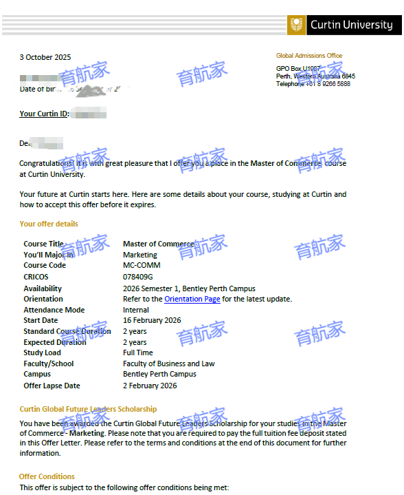 恭喜G同学顺利拿到科廷大学市场营销硕士录取通知书!G同学,国内工商管理本科毕业,成绩刚刚及格,勉强拿到了学士学位证。她在国内工作了1年, 从事的是营销的工作,所以想去澳洲读个性价比高的、可以毕业申请485工签的营销硕士。给她推荐了科廷大学,目前已经顺利拿到有条件录取,就等她考雅思了。