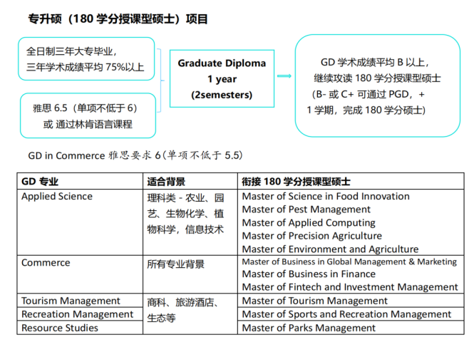 顺利完成学士后文凭课程(Graduate Diploma with Major in Management or Marketing)可衔接Master of Management with Major in Management or Marketing第一学年第二学期。GD 8个月 含60学分硕士课程 + Master 1年 120学分
